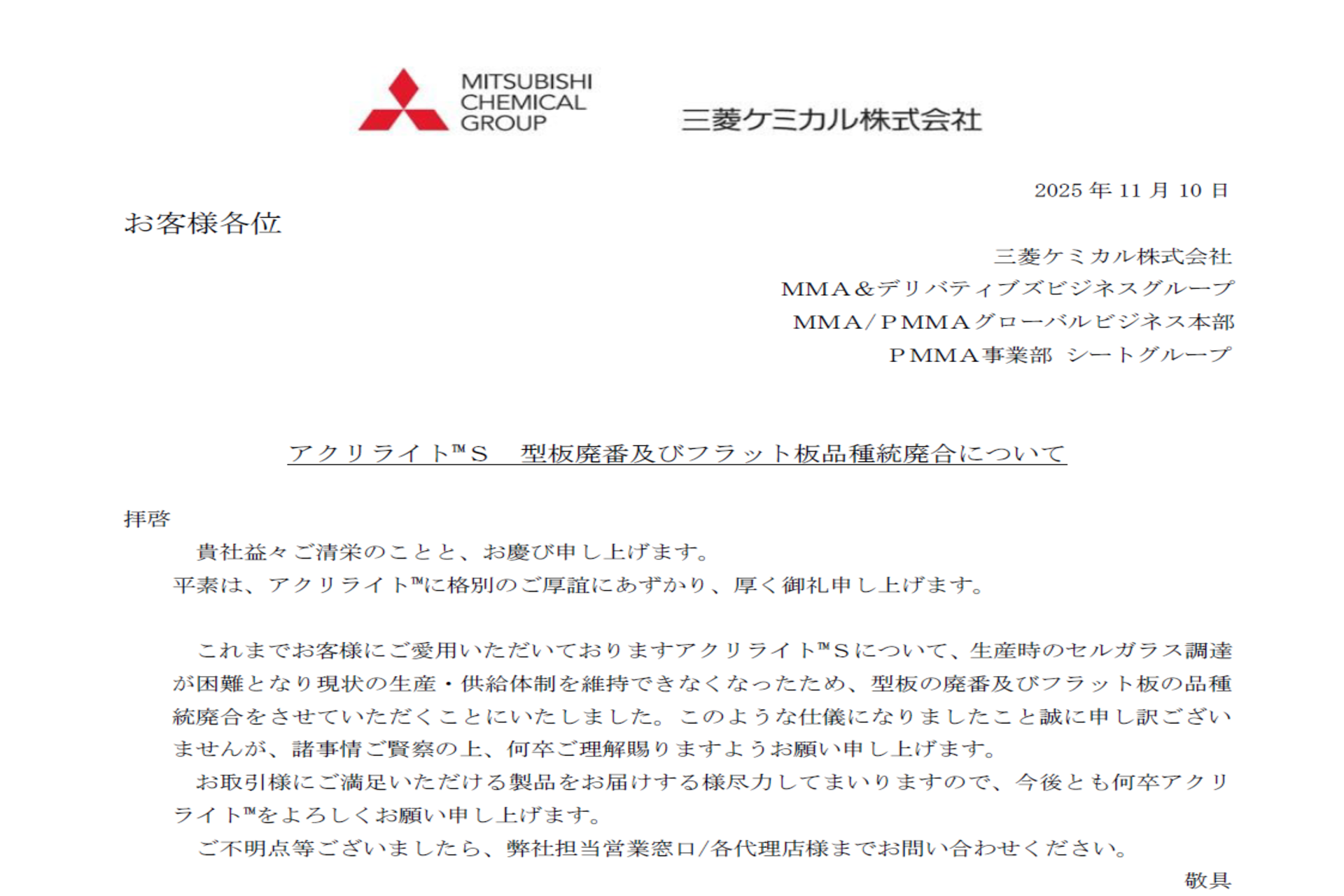 アクリライト™S 型板廃番及びフラット板品種統廃合のお知らせ