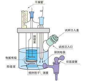 如图1所示,需要两种类型的库仑试剂:一种是阳极电解液,置于电解池的阳极室中,另外一种是阴极电解液,置于电解池的阴极室中。库仑试剂不需要估定。 另一个优点是可以反复使用。