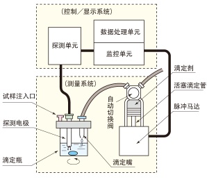 用滴定剂进行滴定,滴定量(mgH20/mL)是事先确定的。试样的水分含量是由滴定容量(mL)确定的。
