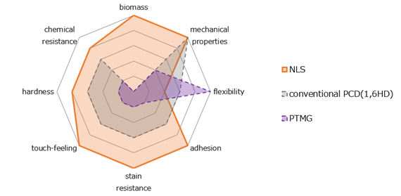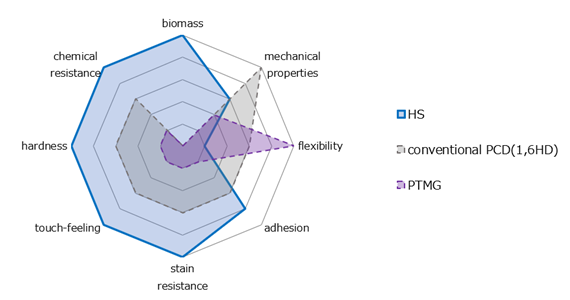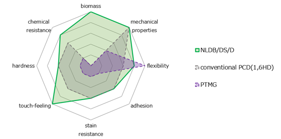 BENEBiOL™ is the biomass-based PCD developed by our proprietary manufacturing technology. Because of “key monomer“ of each grade, polyurethane resins based on BENEBiOL™ will show an outstanding property level with regard to flexibility and chemical/stain resistance for example, in addition to the characteristics of conventional PCD. Besides, your product will be equipped with unique touch and feeling.