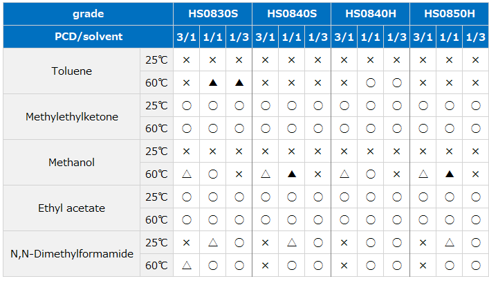 ◯:soluble、△:mostly soluble、▲:emersion、×:insoluble、◆:crystallized