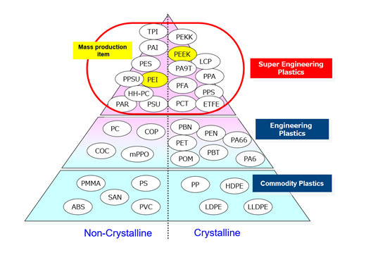| Resins | PEI | PPSU | PEEK | PI | PEN | PPS | ||