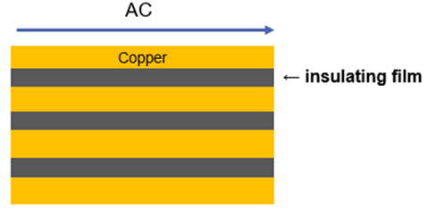 By laminating ALSET™, a metal–resin film composite material, in a metal/resin/metal/resin/metal... structure, the impact of the skin effect can be significantly reduced. This design lowers AC resistance, promotes more uniform current distribution, and helps suppress heat generation.