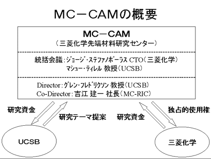 MC-CAMにおいては、MCCのCTOであるステファノポーラス教授とUCSBの工学部長であるティレル教授を中心に組織される統括会議(Governing Board)で研究戦略と方向性を決定し、UCSBのフレドリクソン教授(MC-CAMのDirector就任予定)と、三菱化学の米国における研究開発現地法人であるMC-RIC社(MC