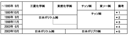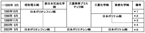 三菱化学(株)と東燃化学(株)が、PE及びPP事業の販売部門を統合し、日本ポリケム(株)発足(出資比率:三菱化学(株)50%、東燃化学50%) |