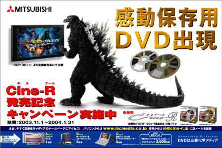 三菱化学メディア株式会社(本社:東京都港区、社長:小林喜光)は、フィルム映写機のリールをレーベルデザインのモチーフにした録画用DVD-Rディスク'Cine-R(キネアール)'の発売を記念し、"感動保存用DVD出現"「'Cine-R'発売記念キャンペーン」を2003年11月1日より実施いたします。'力強く、永く愛されるブランド'を象徴するキャンペーンキャラクターとして「ゴジラ」を起用し、各種広告媒体及び店頭などで'Cine-R'発売広告ならびにキャンペーン告知を幅広く展開します。