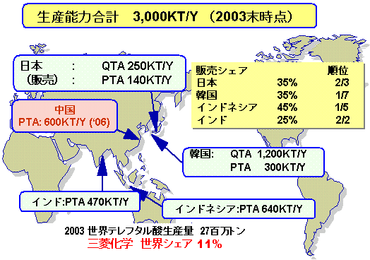 PTA INDIA)の4つの拠点でPTA事業を推進してまいりました。中国においても、経済急成長の中、ポリエステル繊維等の需要が急速に拡大してきています。その原料として使用されるPTAの需要は、2003年中国全体で約830万トン規模に達していますが、総需要の54%を輸入に依存している現状に加え、今後年10%以上の高い需要の伸びが予想されていることから、三菱化学は、これら旺盛な需要に応えるべく、中国国内での製造設備設置について事業化検討を実施してまいりました。その結果、世界でトップクラスの三菱化学独自の製造技術を用いることにより、中国国内においても品質・価格面で競争力のある製品をお客様に提供することが十分可能であると判断し、今回の事業化を決定いたしました。三菱化学は、本事業推進に当たっては、中国合弁新社の流通・販売面及び原料調達面の機能強化が不可欠と考え、伊藤忠及び三菱商事に今回のプロジェクトへの参画を要請し、今般両社と合意いたしました。