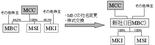 MBC・MKI・MSIの3社の事業を、それぞれに適用される各種法令等の制約の下で、その継続に支障のない形で統合し、シナジーを早期に実現できる組織運営を検討した結果、事業持株会社形態を採用することが最善であると判断いたしました。具体的には、MBCの現法人格を活用して事業持株会社(以下「新社」)とし、その傘下に同社の現事業並びにMKI及びMSIを株式交換方式により新社の100%子会社として組み入れ、3社で新グループを形成します。(末尾の図1参照)