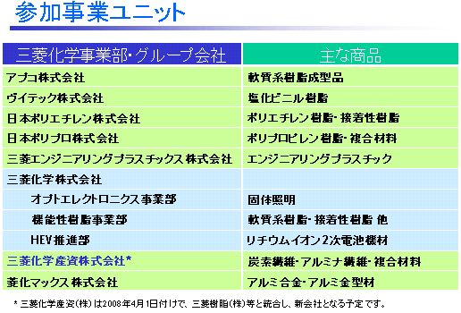 今般、当社は、グループの自動車分野における総合力を発揮し、参加事業ユニットの事業*を強力にサポート・推進するための窓口として、自動車関連事業推進センターを設置いたします。同センターは、マーケティング部と開発部からなり、マーケティング部は、複数の事業にわたるテーマや新素材に関するお客様のニーズを取り扱う総合窓口の機能を、開発部は、マーケティング部の情報をベースに複合素材や新素材・モジュールなどの次世代テーマに関しての共同開発を推進していきます。