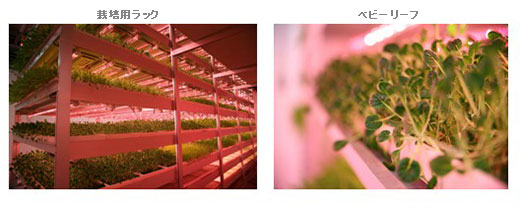 今回の栽培品種はベビーリーフおよびレタスです。ウレタン樹脂を用いた栽培ベッド上に、極めて高い密度で播種する独自の超密植栽培技術により、単位面積あたりの高い収量を実現しています。また、クリ−ンな環境下で水耕栽培をおこなっていることから、収穫後は洗浄せずに口にできるため、ベビーリーフの場合、一般的な露地栽培の品と比べても十分なコスト競争力を持っています。