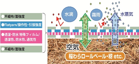 当社の開発した「乾っとシート」は、天日乾燥して含水率を30%程度にした稲わらロールを屋外の地面に置いた樹脂製パレットの上に積み上げて、それらをまとめて被覆し、屋外で乾燥させることができます。微細な多孔質のポリエチレンフィルムを不織布等で挟む構造のため、雨などの水分はシート内部に通さず、稲わらに含む水蒸気はシートを通して屋外へ効率的に放出することが可能です。この特長により、通常、5〜7日程かかる天日乾燥工程を約2日に短縮できるため、長雨に対しても有効な対応策と考えられるほか、保管倉庫やラッピングが不要になるために、従来に比べて手間やコストの軽減に繋がります。さらに、霜降り肉に代表される高級和牛の餌となる乾燥稲わらは、保管倉庫等で半年から1年間保管し、β‐カロテンの含有率を低下させることが知られていますが、同製品を使用する場合には、数か月程度で効果が表られるという実証結果を得ています。