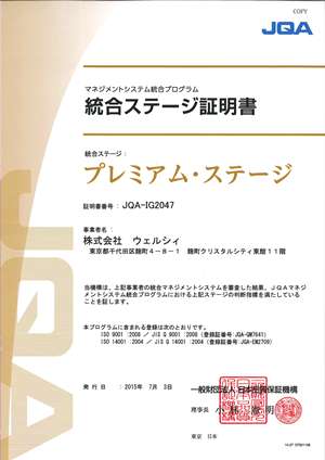 これまでもウェルシィは、MSを本来業務に活用するため、2013年5月に事業継続MSであるISO22301の認証を取得するなど、積極的にMSの取得に取り組んでまいりました。JQAにおいて「プレミアム・ステージ」の認定は4社目となりますが、「ステージⅠ」、「ステージⅡ」、「プレミアム・ステージ」と段階を踏んで認定を受けた初めての会社です。また、ウェルシィはMSをうまく活用している企業として、本年3月に経済産業省が発行した「マネジメントシステム活用事例集」で紹介されました。