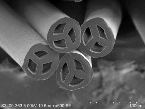 このたび開発しました《ライブエア》は、ポリプロピレンマルチフィラメント《パイレン》の中空断面糸で、三つの中空部を有する三芯中空断面糸です。