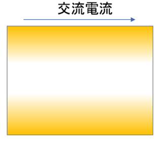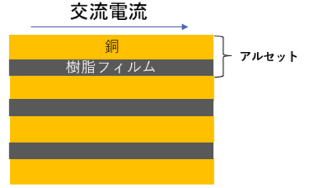 交流かつ高周波の場合、銅単体のバスバーでは「表皮効果」により電流が表層に集中し、電流が流れる断面積が小さくなるため、発熱(温度上昇)が大きくなります。一方で金属・樹脂フィルム積層材 アルセット™を積層し、金属/樹脂/金属/樹脂/金属…という構成のバスバーにすることで、表皮効果の影響を低減し、交流抵抗を小さくすることができるため、発熱(温度上昇)の抑制が期待できます。