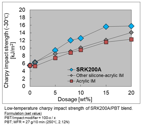METABLEN SRK200AはPC/AS系, PC/PEs系アロイの衝撃強度を改善します。