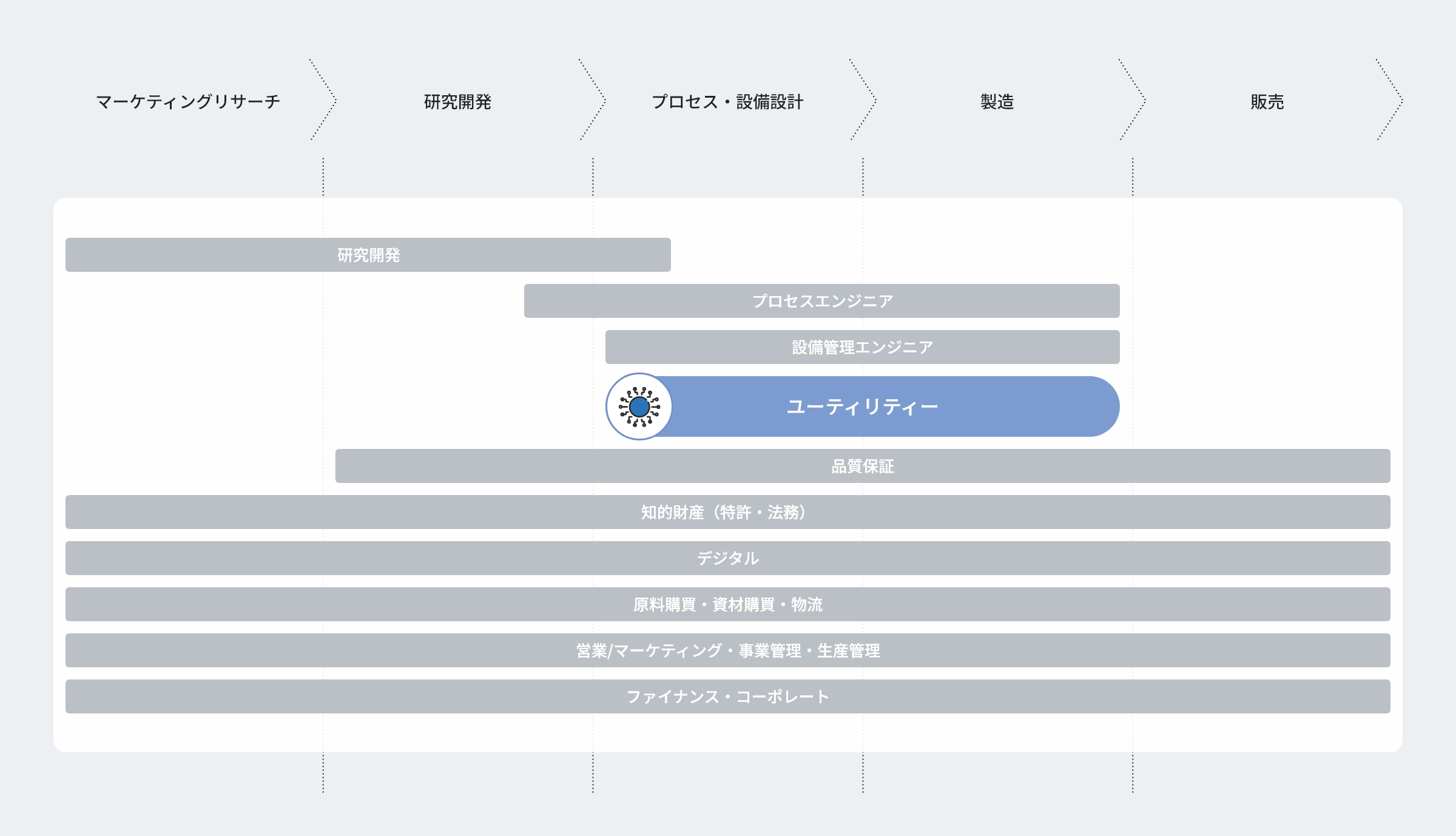 ユーティリティ※エンジニアは、製造プラントの稼働に不可欠な電気・蒸気・水・ガスなどのエネルギーを、発電設備を含め安定的に製造・供給する重要な役割を担います。エネルギーの合理化・省エネの推進に加え、再生可能エネルギーやLNG発電など環境負荷の低い供給体制の導入にも取り組み、プラントの安全・効率・持続性を支える“隠れた要”として機能します。