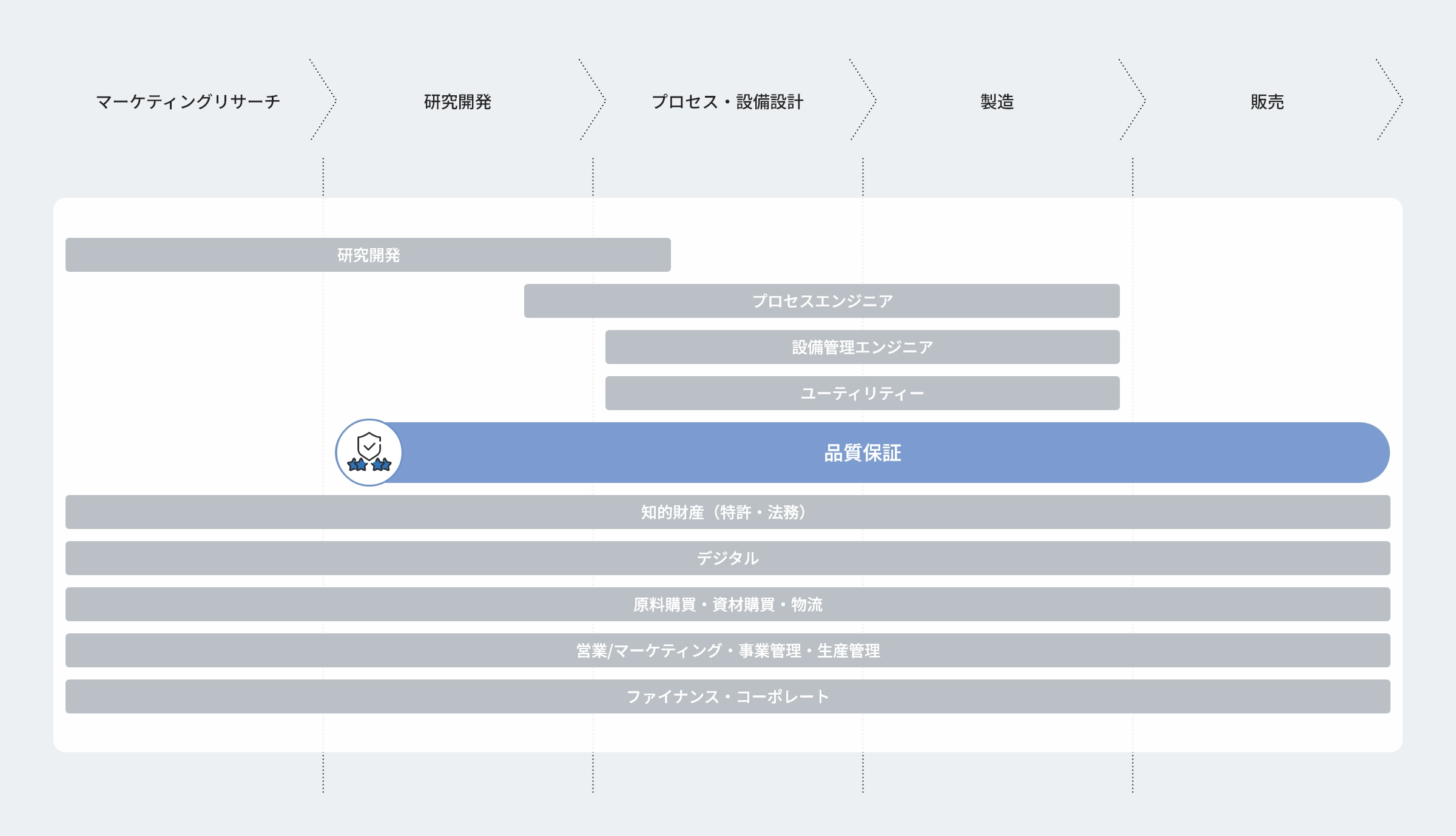 製造部・試験部門に加えて、研究開発、設備管理、営業、購買など幅広い部署と協働しながら業務を進めます。多様な視点で品質に向き合うことで、専門知識だけでなく事業全体を俯瞰する力が身につく点が大きな魅力です。積み上げたスキルは他部署でも通用し、品質保証のエキスパートとしてキャリア形成する道も開かれています。