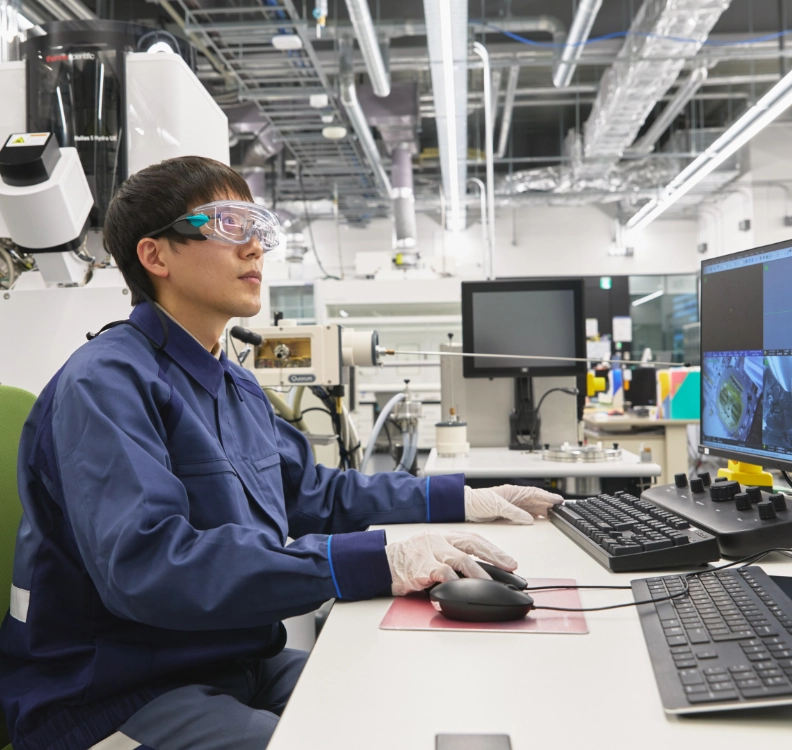 私は主に無機材料を担当しており、発生ガス分析、分光分析などを駆使した分析のほか、in-situと呼ぶ、反応中という条件下で分析を行う新技術の研究開発に取り組んでいます。また、最新のテーマとして、材料をナノレベルで削りながら断面を観察できる電子顕微鏡(FIB-SEM)を活用しています。この装置を用いて、材料内部の構造を3次元で再構築し、可視化する自動測定フローの開発を進めています。
