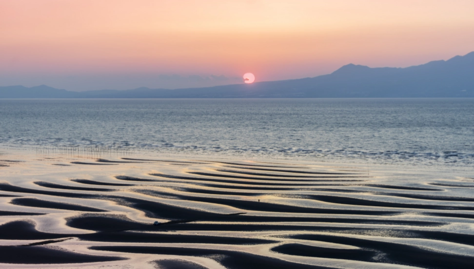 日本の「渚百選」「日本の夕陽百選」に選定された景勝地です。潮が引くと現れるのは、風と波によって描かれる三日月型の模様。年に10日あまりの絶景日には、国内外から何百人というカメラマンが訪れます。