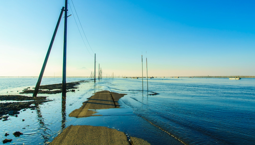 海の中へひたすら続く道と、そのかたわらの電柱の組み合わせが「インスタ映え」すると一躍有名になったスポットです。隣接する住吉海岸公園にはONE PIECEの麦わらの一味「ジンベエ像」が設置されています。