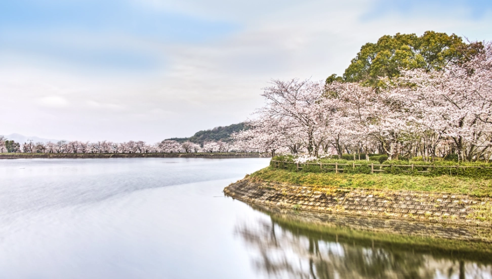 加藤清正が掘った立岡池と花園池を囲むようにして、約2,000本の桜並木があり、県内有数の桜の名所として有名です。夜間ライトアップされる期間もありシーズンには多くの花見客で賑わいます。